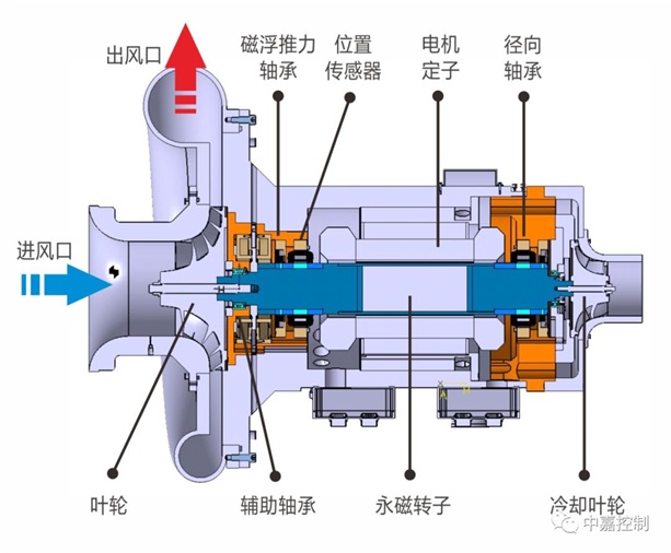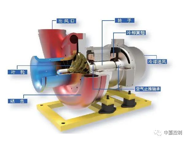 磁悬浮鼓风机:采用无接触、无机械冲突的磁悬浮轴承和高效永磁同步电机直接驱动高效离心叶轮,克服了传统风机的不足,具有高效低噪的特点。