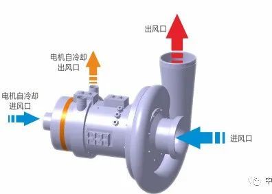 1.风机工作原理:中嘉磁悬浮高速离心鼓风机采用高速永磁同步电机直驱结构,将离心式叶轮与电机驱动融为一体。它通过内置位移传感器检测转子轴的振动和转子轴的空间间隙,并将得到的信号送入磁悬浮轴承控制器进行调理、分析、计算,产生控制电流,再将电流输入磁悬浮轴承的绕组线圈,产生电磁力,从而实现转子轴的悬浮。永磁同步电机的主要作用是驱动转子轴旋转,它通过变频器产生频率可控的电流,将此电流输入到电机定子产生的旋转磁场中,驱动转子轴高速旋转。风机的主要作用是实现送风,叶轮随转子轴高速旋转,带动空气对空气做功。空气从蜗壳的入口收集器进入,在蜗壳的引导和加压下,成为具有一定流速和压力的气体,最后从蜗壳的出口吹出,从而引起风机鼓风,实现具有一定压力和流量的气体的输送。