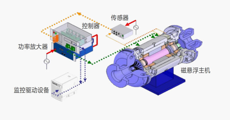 磁悬浮空气压缩机是集磁悬浮、变频、高速永磁同步电机和高速叶轮等成熟技术于一身的高科技工业产品。主动式悬浮磁轴承可将压缩机转子保持在最佳位置,变频技术实现了压缩机的低电流启动和全工况智能调节,高速电 机和高速叶轮的应用实现了整机效率高,体积小、重量轻。与传统空压机相比,磁悬浮空气 压缩机没有齿轮增速,无需润滑油,振动小,噪音低,可节能约20%。